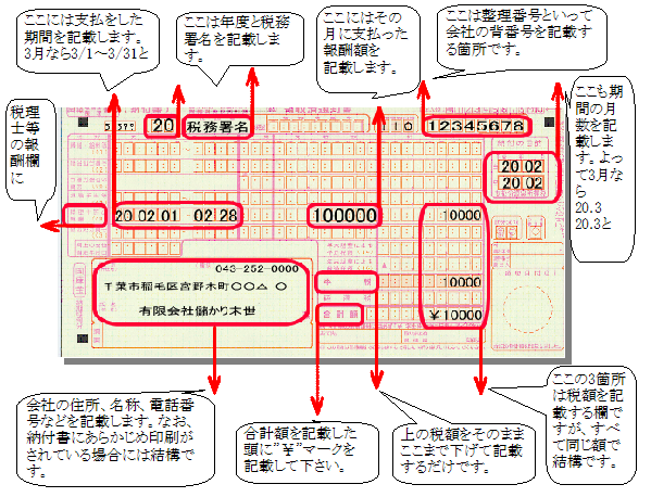 源泉税をその10%の10,000円を徴収したという前提で作成をした納付書となっ