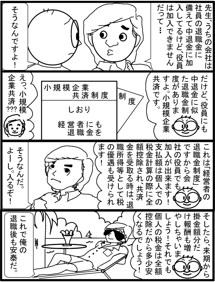 顧問先様には、様々な内容のメルマガをお送りしておりますが、例えば小規模企業共済についても加入をすると15年度どの程度、20年度どの程度の額が節税になるかというシュミレーションを実施して、そして、その後はもしも死亡退職をした場合の受取人は誰になるのか?という内容をご案内させていただいております。入り口だけでなく出口もご案内することが大事だと思っておりますので:::