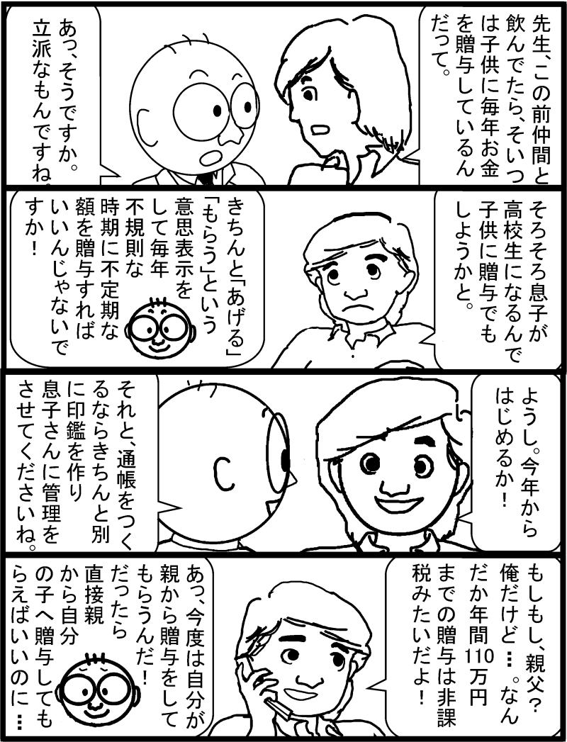 なお節税本の中には、111万円を贈与した申告書を提出し、基礎控除額を超えた1万円に対しての税額1000円を納付すべきという人がいます。しかし、そのような必要はありません。なぜなら、申告していても贈与の意思が確認できなければ贈与という行為が認められないのであって、申告で認められるものでないからです。